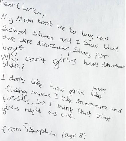 Enquiring as to why dinosaur shoes were aimed solely at boys, the confident little girl laid her cards on the table, writing: "Why can't girls have dinosaur shoes? I don't like how girls have flowery shoes. I like dinosaurs and fossils, so I think that other girls might as well."