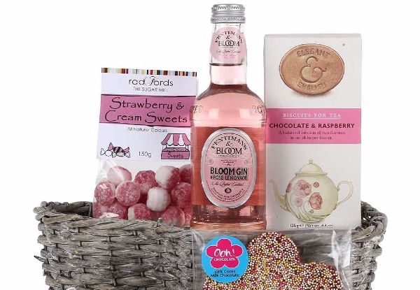 The description says: "This delightful gin gift is perfect for the ladies that love nothing more than to relax with a G&T! The delicious Bloom gin and rose lemonade is accompanied with a chocolate flower, Strawberry sweets and raspberry biscuits! This really is a gift that will be fantastically received. Presented in a heart shaped willow basket."