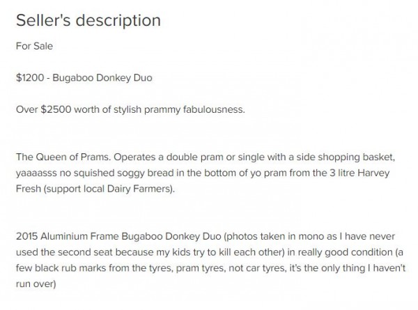 Every now and again, a gem will shine through from the mass of ‘Buy & Sell’ ads online, and we would like to thank Nikki for this morning’s lol-fest at MummyPages HQ.
