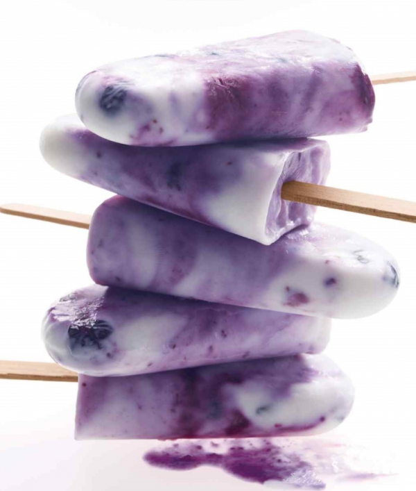 Pour yoghurt and blueberry mixtures, alternating them, into ice-pop moulds.
