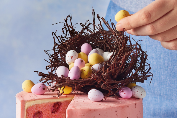 Leave to harden in the fridge. Remove the foil and top the cake with the nest. Fill with mini eggs.