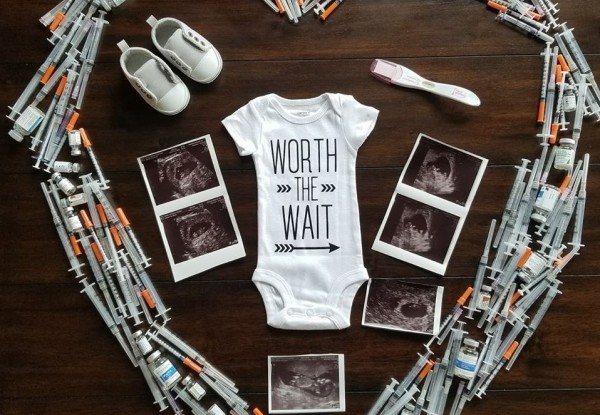 In the centre lies a baby’s vest, the words emblazoned across it reading, ‘Worth the wait’. Beside the vest lie sonogram photos of a baby as well as a positive pregnancy test and a pair of baby shoes. Is there anything more heart-warming?