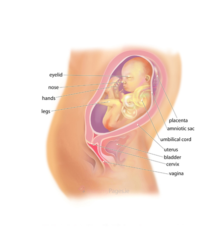 Your baby’s ears are now more defined, and the inner nerves are much more developed making the sense of hearing much more acute. Your baby can probably hear your voice, your partners’ voice, and the everyday sounds in your world.